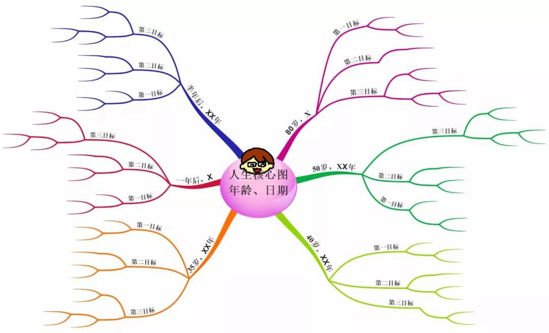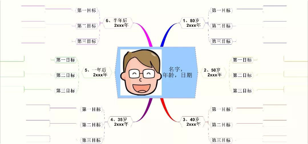 (六大主干可根据绘图者的具体年龄进行微调。核心理念是从老年往回推算,时间间隔先疏后密。最后两个主干“一年后“,”半年后“则可不需要调整。)